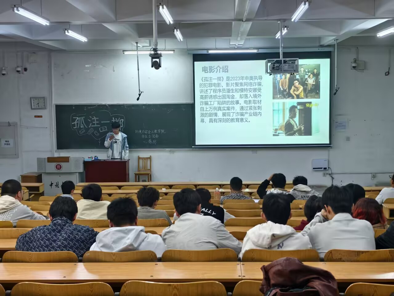 为进一步加强大学生心理健康教育,保障学生安全校园文化生活,引导学生关注内心世界,培养积极向上的心理品质,在2025年5月9日下午7点,心缘坊学生会组织了一场以“谨防诈骗,拥抱阳光”为主题的心理健康电影观影活动,本次播放的影片为经典心理电影《孤注一掷》。