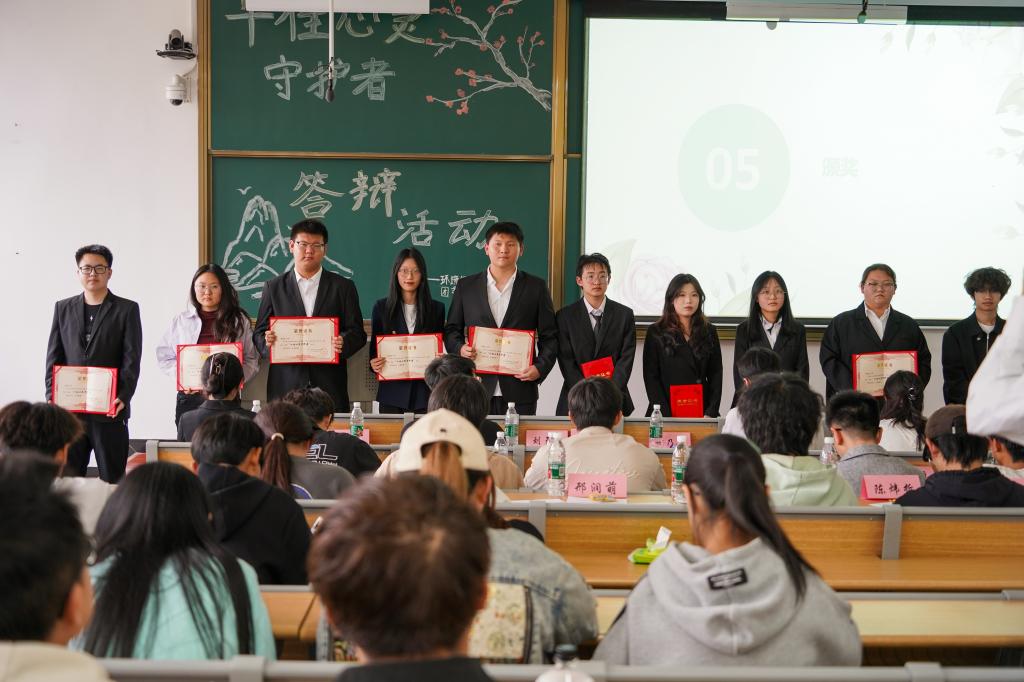 在答辩环节,参选的答辩人通过个人简介、工作成果汇报、工作心得分享和未来规划四个部分答辩,生动展现了他们在心理健康服务中的实践与思考,答辩人真挚的讲述和独到的见解赢得了评委和同学们的热烈掌声。活动进行到中段,主持人还组织了趣味游戏环节,通过精美礼品的赠送,进一步增进了同学们的参与热情。经评选,十位表现突出的同学被授予"十佳心灵守护者"荣誉称号。颁奖结束之后,各位答辩选手、评委及工作人员合影留念。