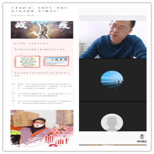 各班和团支部通过QQ群、微信群等“云”载体开展形式多样、内容丰富的“云”班会暨主题团日活动,号召全体学生增强抗疫信心、掌握防疫知识、提升防疫技能、提高政治辨识力,用实际行动助力疫情防控。组织落实好“全国大学生同上一堂疫情防控思政大课”工作。持续推进“青年大学习”工作,做到在思想教育引领和政治学习上没有一个学生掉队。