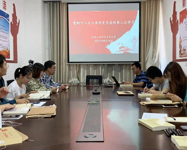 2021年6月10日上午,环境工程研究生党支部在科学楼C座614会议室开展了主题为十八大以来历史交流的第六次党史学习。会议由支部任晓斌同志主持,支部全体党员进行集体学习交流。