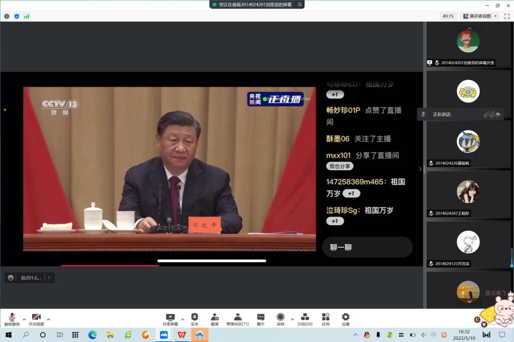 各团支部也以线上集中收听收看方式认真收听收看大会。大家纷纷表示,习近平总书记的讲话思想深刻、内涵丰富,情真意切、催人奋进,作为青年学子,感觉备受鼓舞。共青团是党的助手和后备军,新时代青年一定要争做有信念、有梦想、有奋斗、有奉献的人,在实现中国梦的伟大实践中书写灿烂青春。