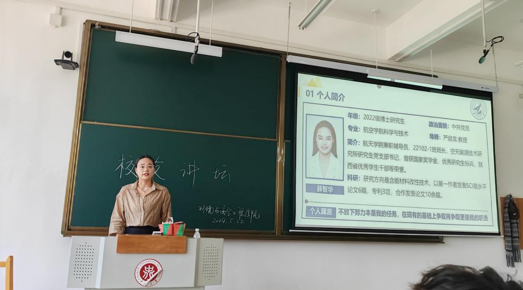 邀请2015级校友,西北工业大学在读博士薛智华为特种能源技术与工程专业学生开展“榜样的力量”校友讲坛。