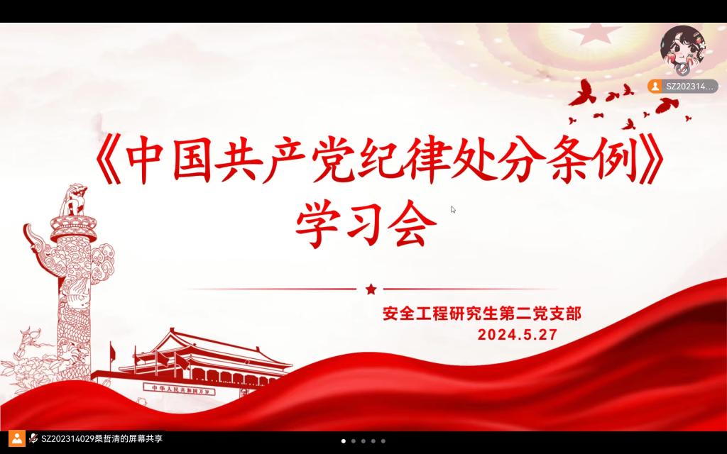 安全工程研究生第二党支部组织全体支部党员通过腾讯会议组织学习《中国共产党纪律处分条例》。