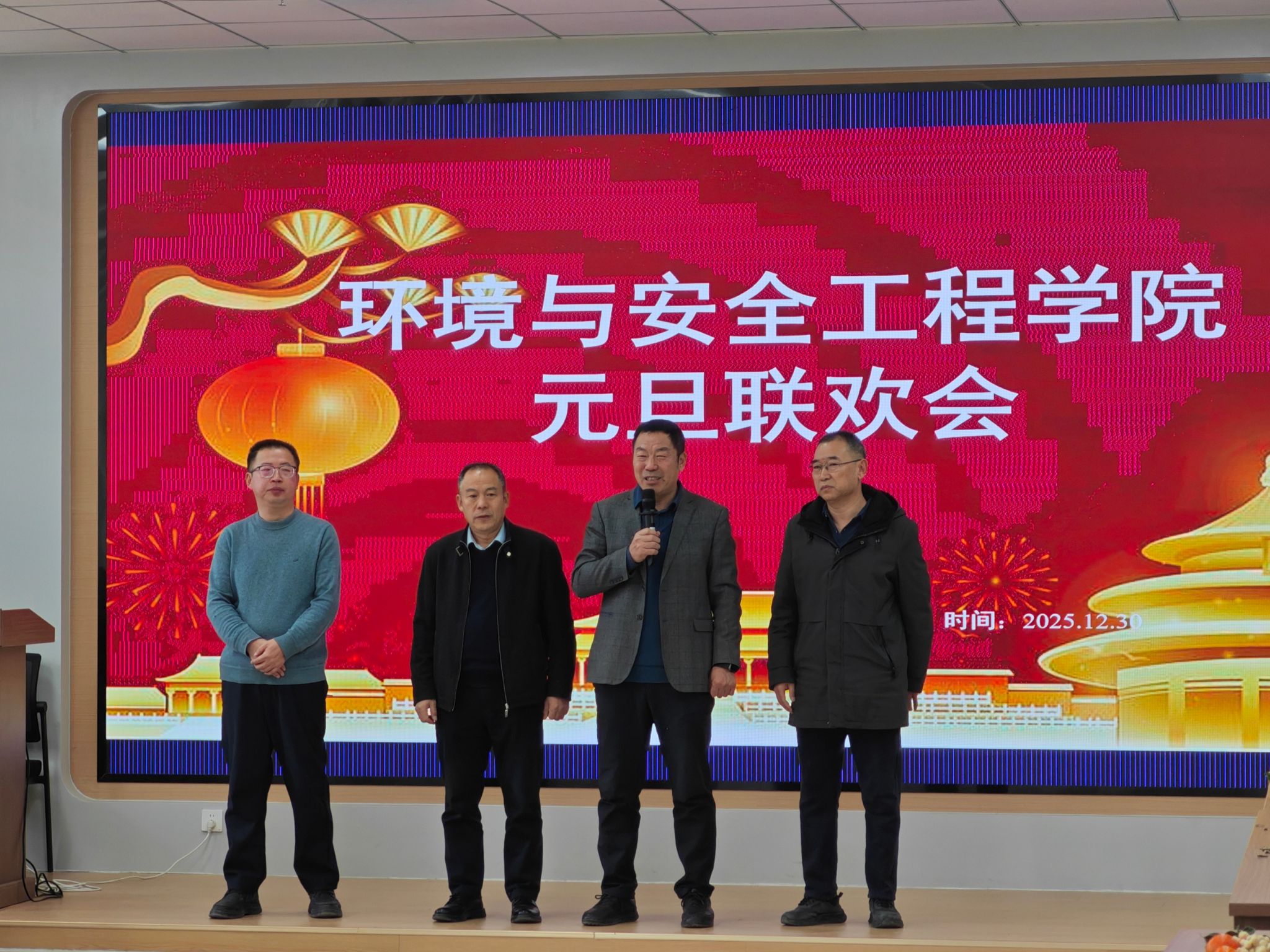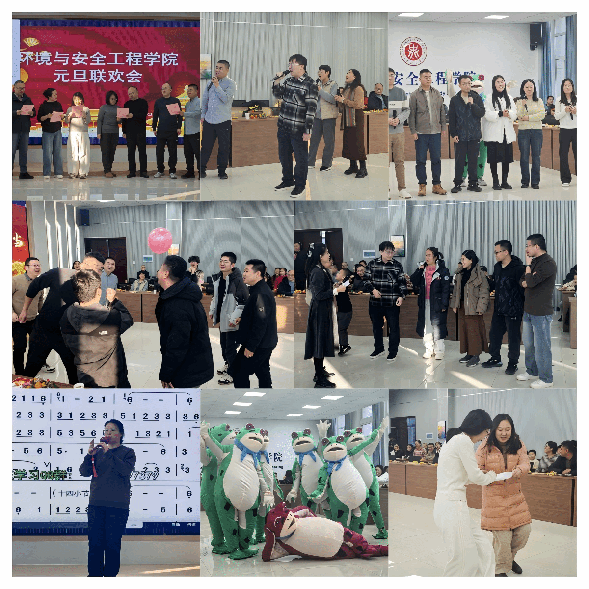 高质量发展的壮志豪情,赢得阵阵热烈掌声。紧随其后,精彩节目轮番上演,喜庆氛围持续升温。杨舒敏老师带来的葫芦丝独奏《月光下的凤尾竹》,悠扬婉转的旋律在会场流淌,让教职工们在丝竹雅韵中舒缓身心、共品佳节之乐。综合科教职工合唱的《笨小孩》,以饱满真挚的歌声传递出不服输、敢拼搏的奋进力量,引发全场强烈共鸣;学生科与教学科教职工联袂演绎的青蛙舞《教师阵线联盟》创意十足,老师们卸下课堂严谨,化身活力舞者,俏皮搞怪的舞姿让会场笑声不断,充分展现了教职工们乐观开朗的精神风貌。土木工程系合唱《朋友》,唤起同事间温暖记忆;环境工程系《上春山》注入朝气。科研科三句半紧扣科研日常,将气氛推向高潮。晚会最终以综合科诗朗诵《我爱你中国》落幕,真挚情感感染全场。