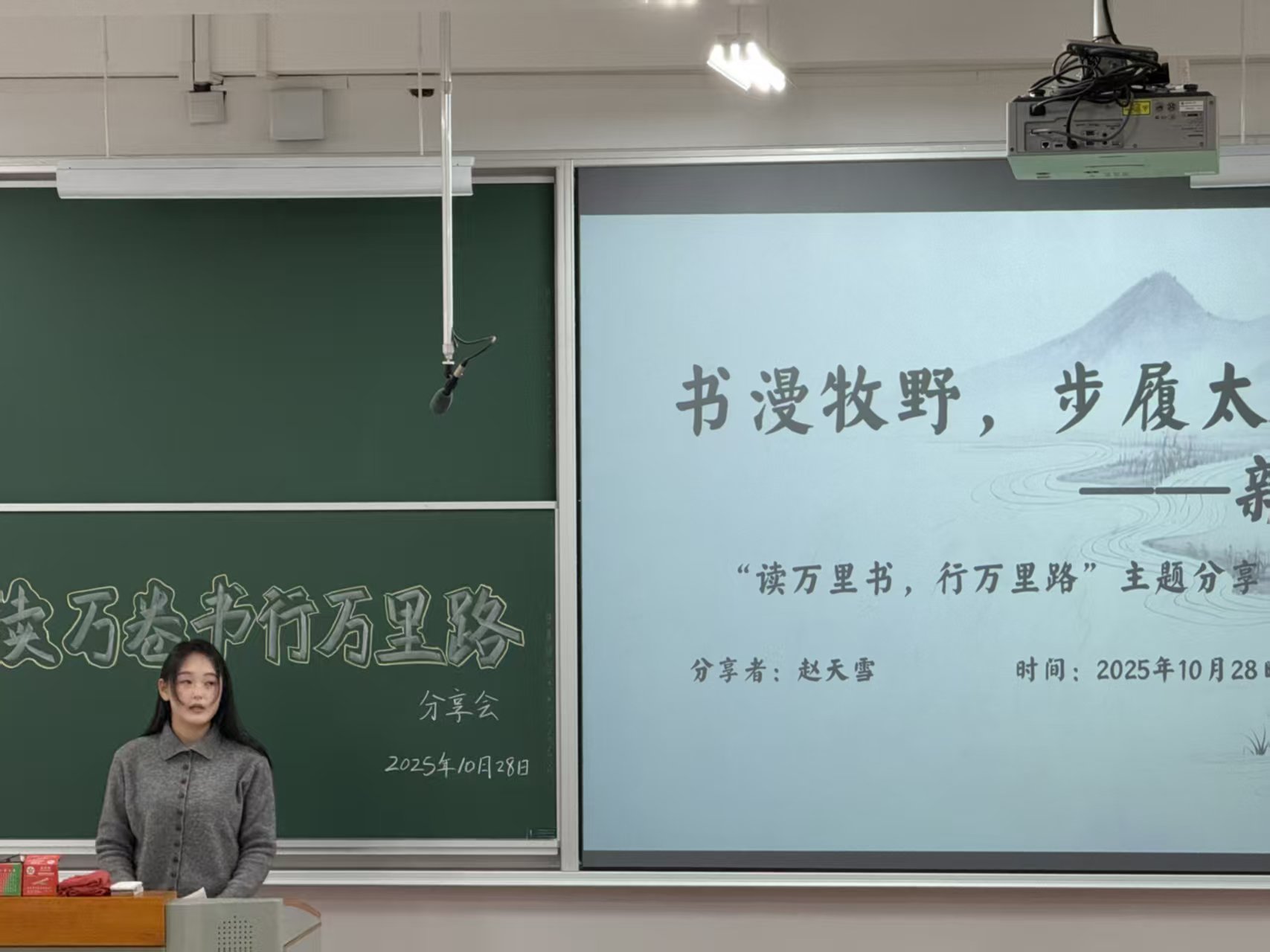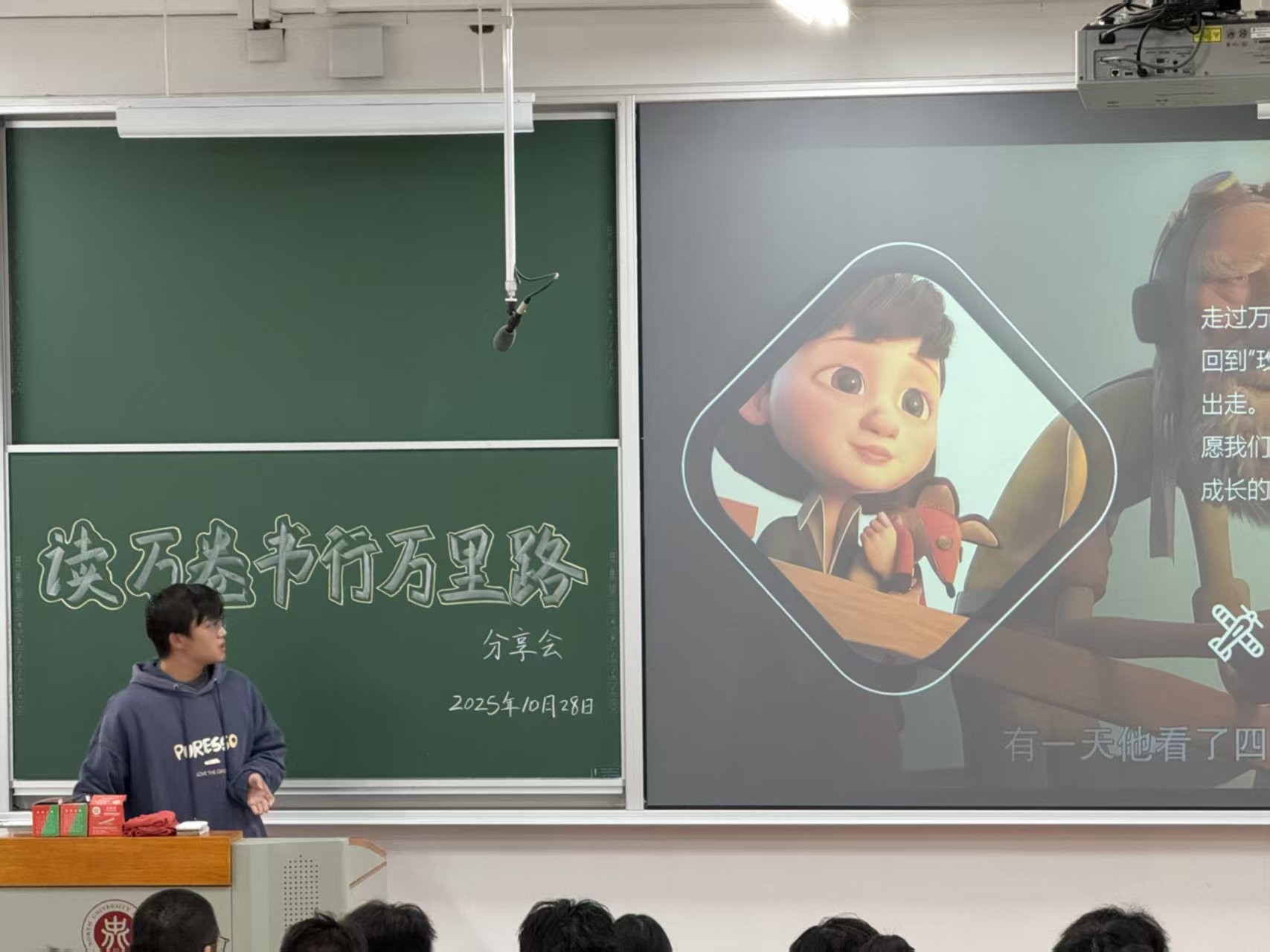 “读万卷书,行万里路”活动在18101H教室成功举办。本次活动以“一书一地”为创意主线,吸引12名师生深度参与,通过12个核心分享环节与3个趣味互动游戏的巧妙串联,搭建起“阅读”与“行走”的双向联结桥梁,实现了知识感悟与实践体验的深度交融。